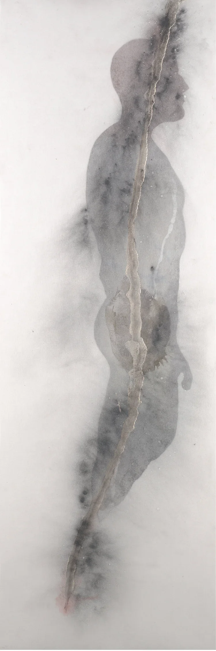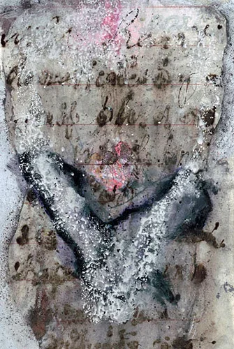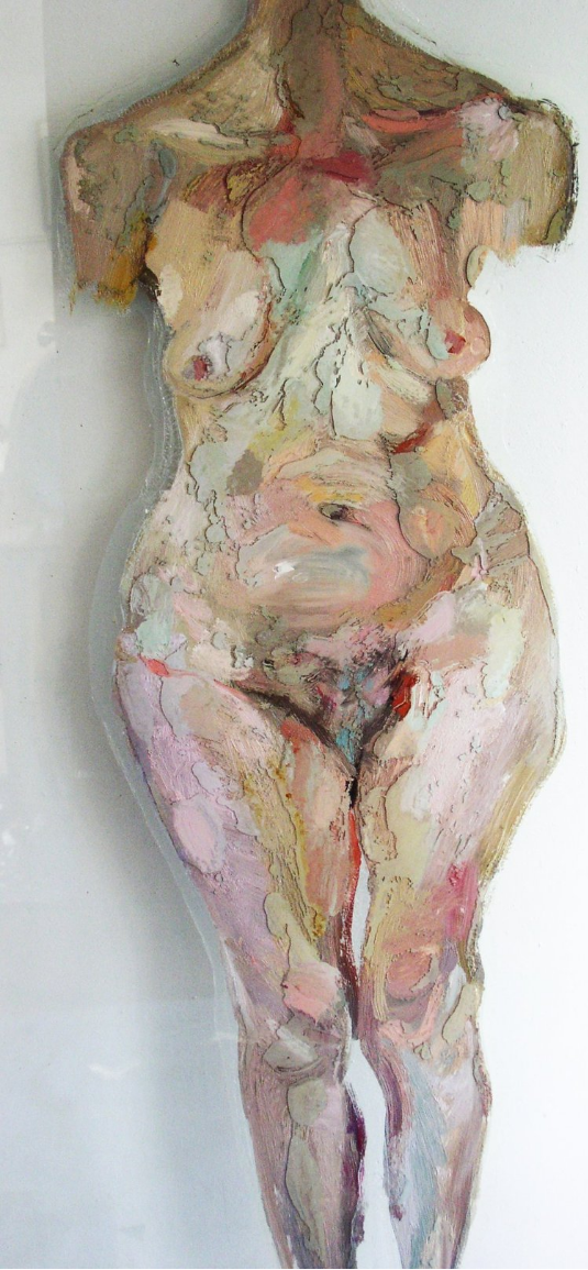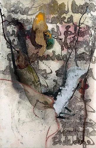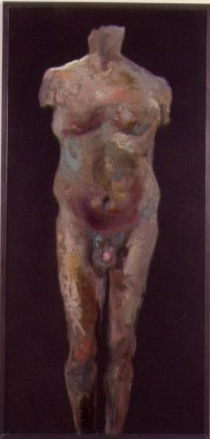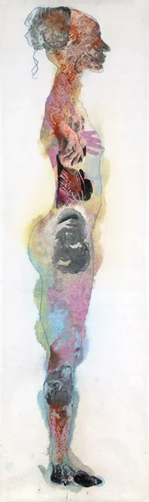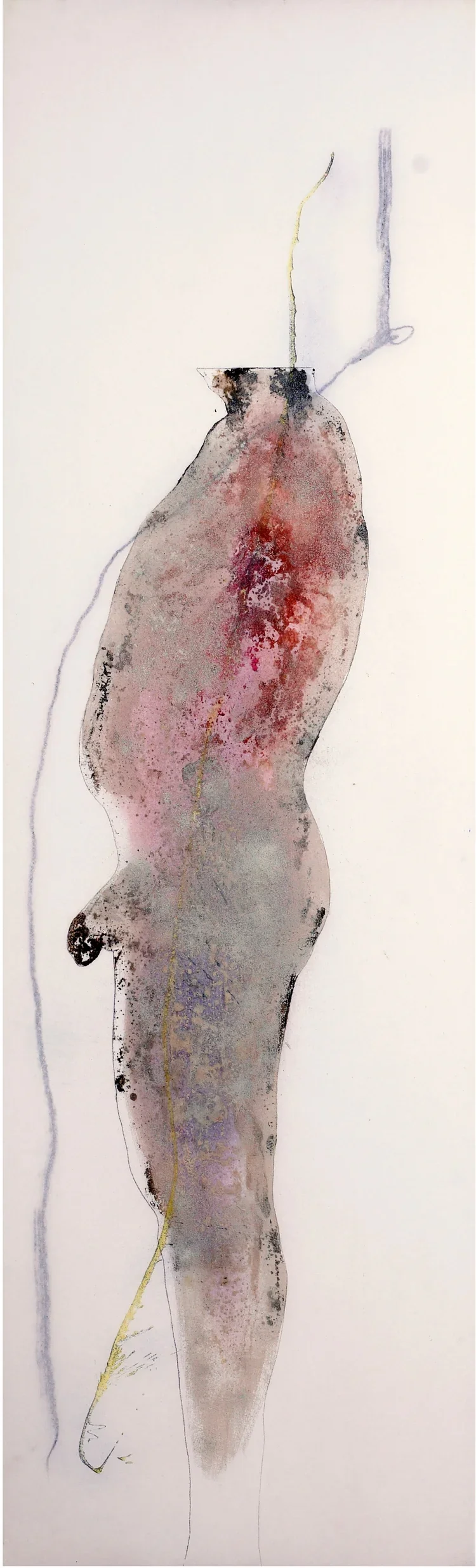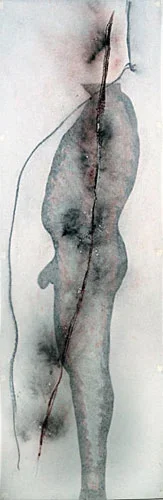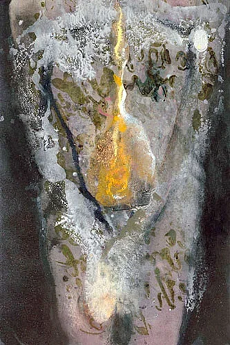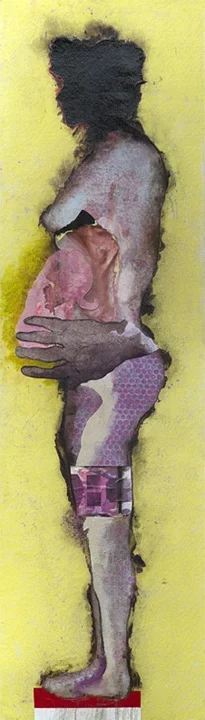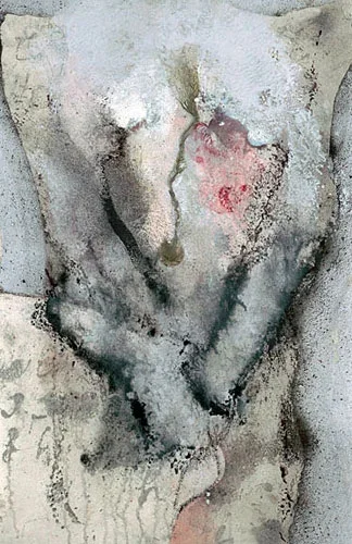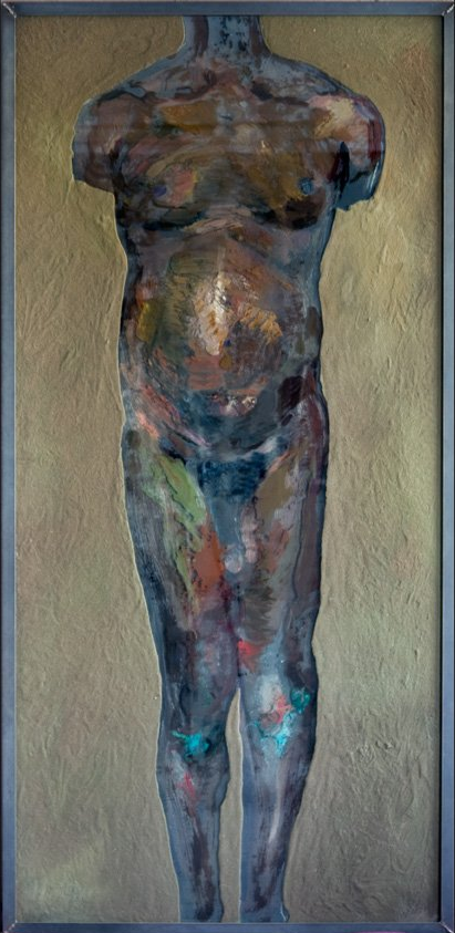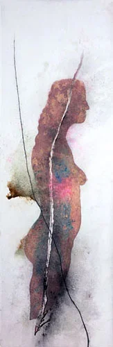 This series of paintings is a visual tribute to Paul Celan, a Holocaust poet who left an indelible body of work that reflects the agony of loss. The motif of the series is a headless torso with hands joined over the genitals to convey vulnerability. The text of his poetry is inscribed on the back of the translucent material synskin, a fiberglass paper. The material appeals to my sense of the impermanence of the body in contrast to the imprint of the written word. Layers of fluid acrylic and oil washes enhanced texturally with pigments, metallic powders and earth allude to the rich decay of the body