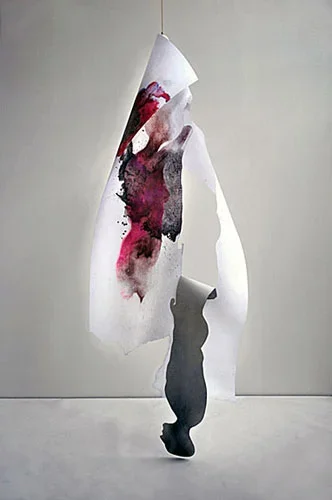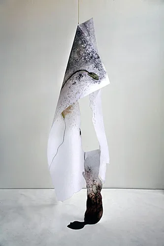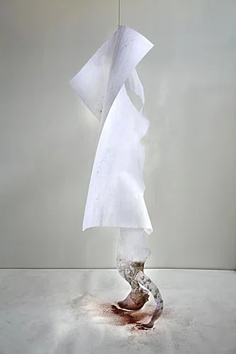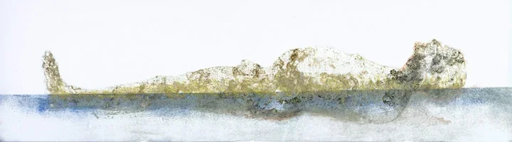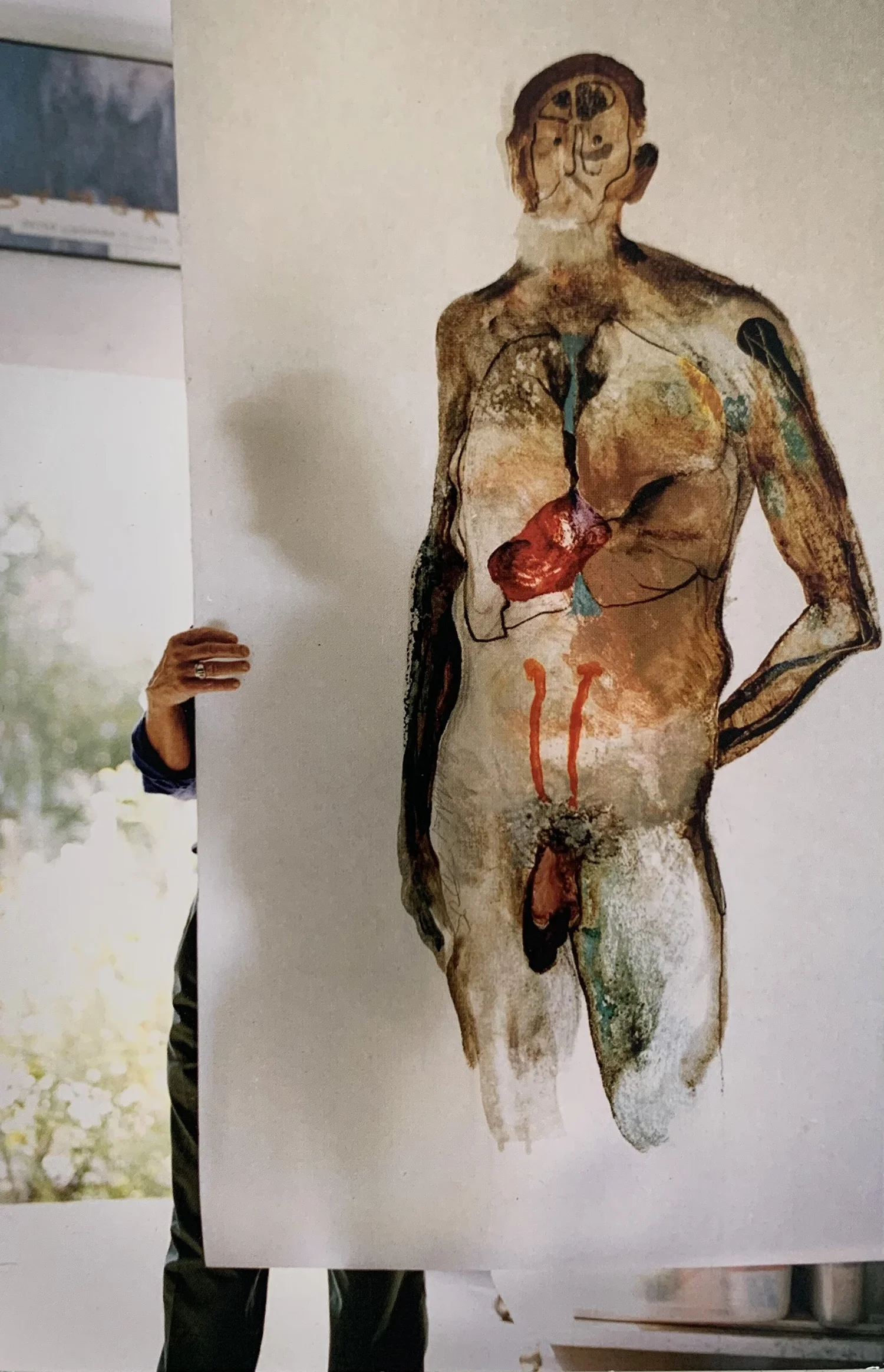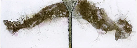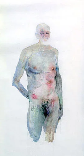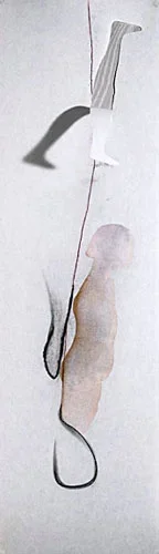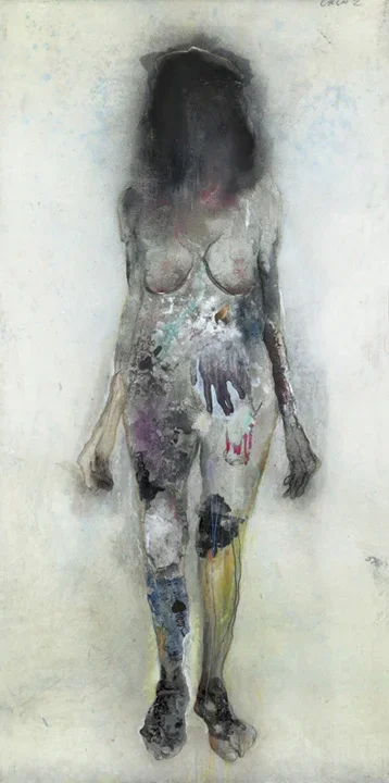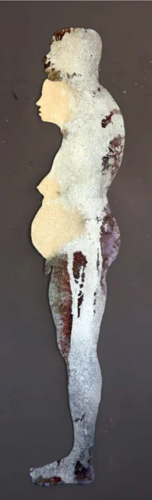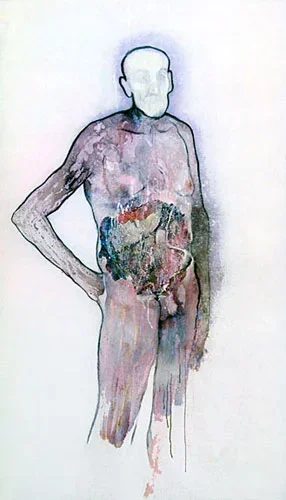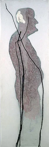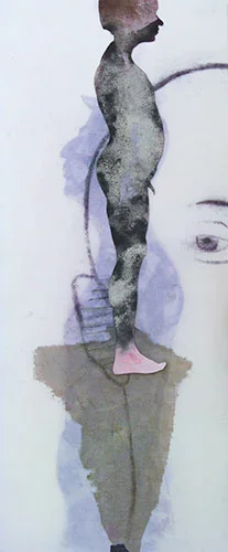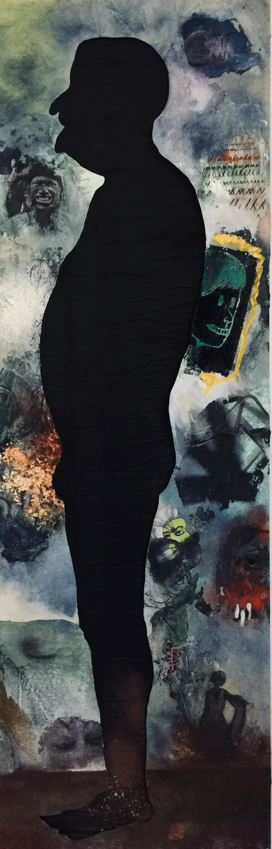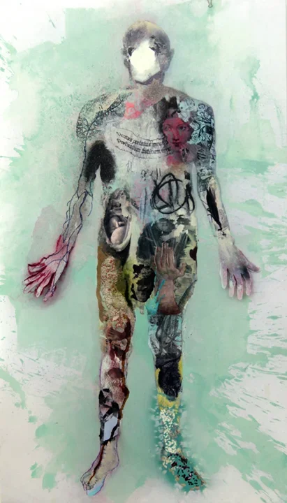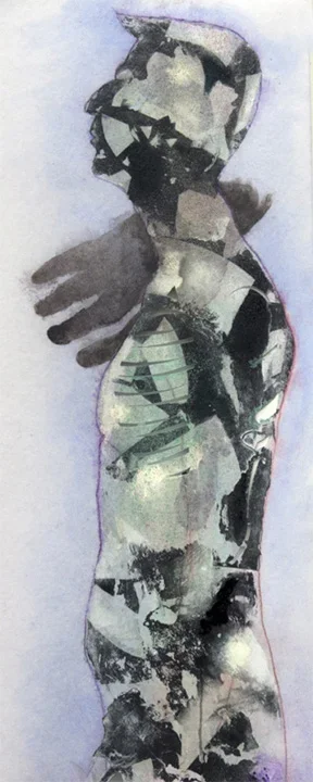 This series of paintings is a visual tribute to Paul Celan, a Holocaust poet who left an indelible body of work that reflects the agony of loss. The motif of the series is a headless torso with hands joined over the genitals to convey vulnerability. The text of his poetry is inscribed on the back of the translucent material synskin, a fiberglass paper. The material appeals to my sense of the impermanence of the body in contrast to the imprint of the written word. Layers of fluid acrylic and oil washes enhanced texturally with pigments, metallic powders and earth allude to the rich decay of the body