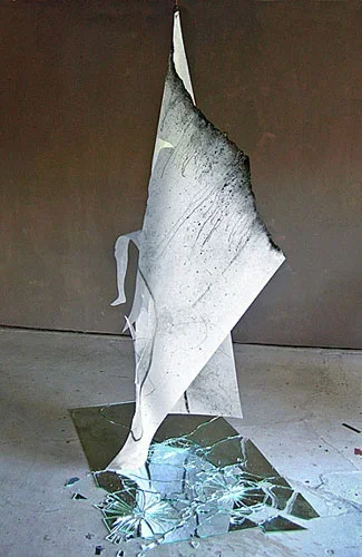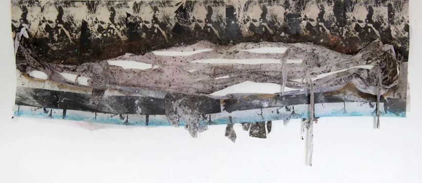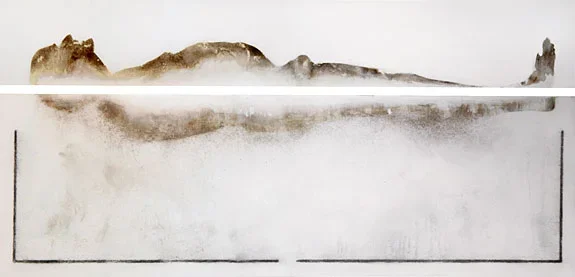 Branded into the synskin, the ghostly silhouettes of men, women and children are interwoven with vertical gestures that allude to spinal columns. The modeling of the bodies is the result of gentle applications of powdered pigments, iron glimmer and adobe manipulated by compressed air. In contrast the gestural forms are executed in calligraphic applications of charcoal and acrylic. These subjects are transitioning from the carnal to the spiritual.