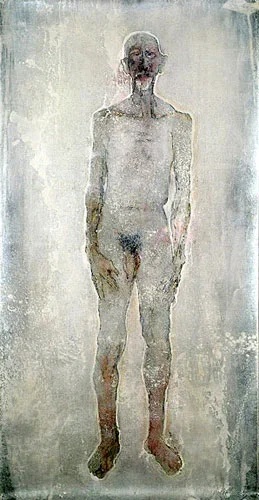 In this series, Homosapiens, the interior of the human bodies is imprinted with fragmented narratives. These tales are part of a fictionalized past-work of the person who is actually depicted. The tattoo-like markings, enhanced with powdered pigments, earth and crushed glass, speak of the complexity of the inner workings of contemporary human beings. Simultaneously the figures are linked to antiquity through their hieratic stance.