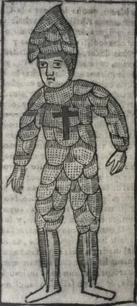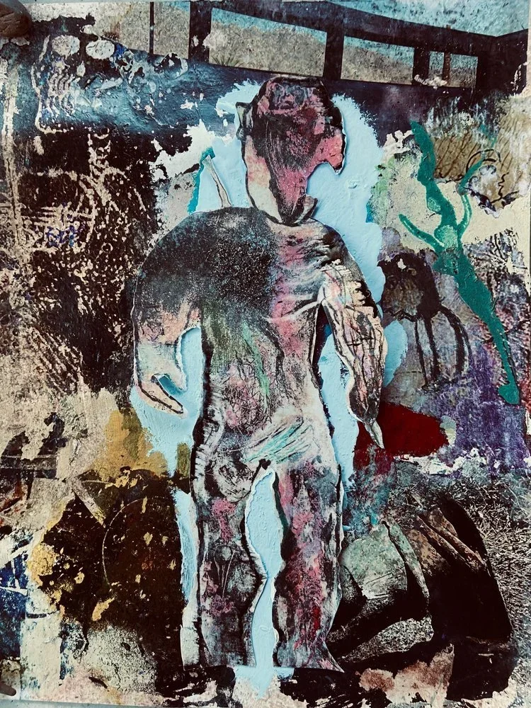 The Duende Series is based on an image taken from a Spanish colonial text found in Oaxaca, Mexico. It represents a gnome-like figure dressed in a plant-like jumpsuit with a headdress. This enigmatic figure intrigued me because of its mythical allusions. The details of the figure and its costume reminded me of the leaded separations of a stained glass window found in Catholic Cathedrals. (Inspiration was born during a show in Oaxaca at MACO, Museum of Contemporary Art and Oaxaca Cultures). For El Grand Duende I transferred a photocopy of the image onto fiberglass mesh and colorized it with acrylic and oil. The frame surrounding the image is ornamented with seeds and the beard is covered with shredded copper filaments. The entire piece is suspended on a curved tree branch. Eventually, this theme expanded into a series of wall hangings, paintings, and lithographs.