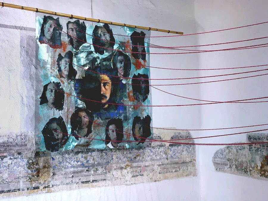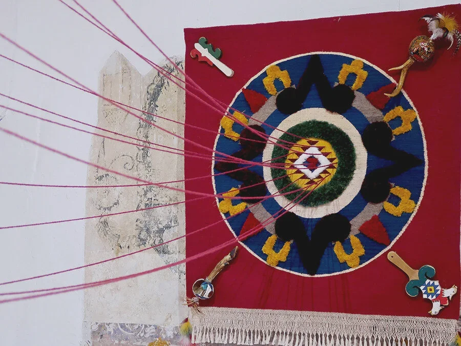 The subject of the piece was an interaction between a group of dancers who yearly performed a ritual dance “La Danza de la Pluma” that commemorates the struggle between the conquering Spaniards and the indigenous population of Mexico. Strands of red wool emerge from the foreheads of each dancer’s portrait, connecting to the central eye of an adjacent wool tapestry, creating a symbolic bridge between both hanging artworks.