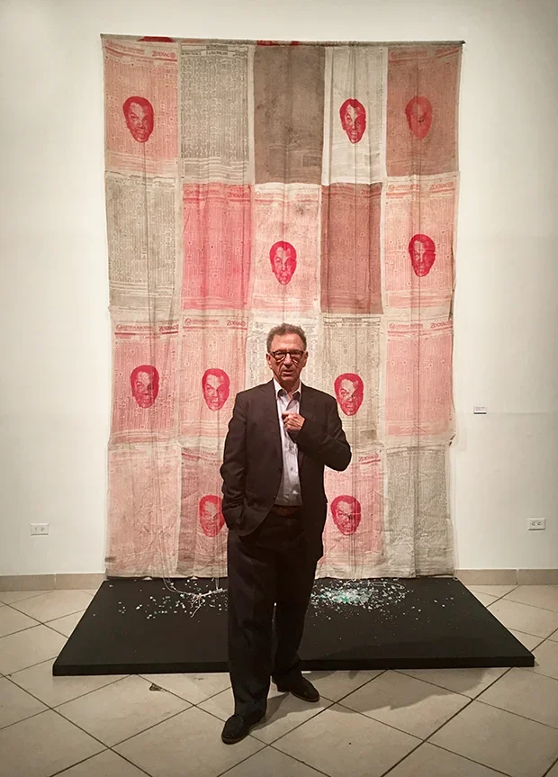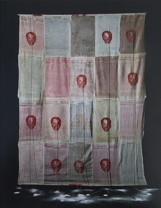 Cantinflas y La Suerte was conceived in Mexico City approximately thirty years ago after witnessing a public tribute held at the Palacio de Bellas Artes after the passing of Mario Moreno, commonly known as Cantinflas. Cantinflas was an enormously popular actor featured in countless Mexican films over the course of half a decade. Referred to as the Charlie Chaplin of Mexico, he was a comic figure personifying the everyday tribulations of the common man. The Cantinflas tapestry consists of twenty sheets of muslin imprinted with proceeds from the Lottería Nacional winning numbers and the iconic face of Cantinflas silkscreened in red. From each right eye emerges a chain tassel that trails to the floor strewn with glass crystals. The Cantinflas tapestry was first shown in Mexico City in 1994 at the Centro Cultural San Angel. Subsequently, it was shown at CEARTE in Ensenada in 2017 as a memorial to the 25th anniversary of his death. Cantiflas y La Suerte has recently been acquired by MACO the Museum of Contemporary Art in Oaxaca, Mexico.