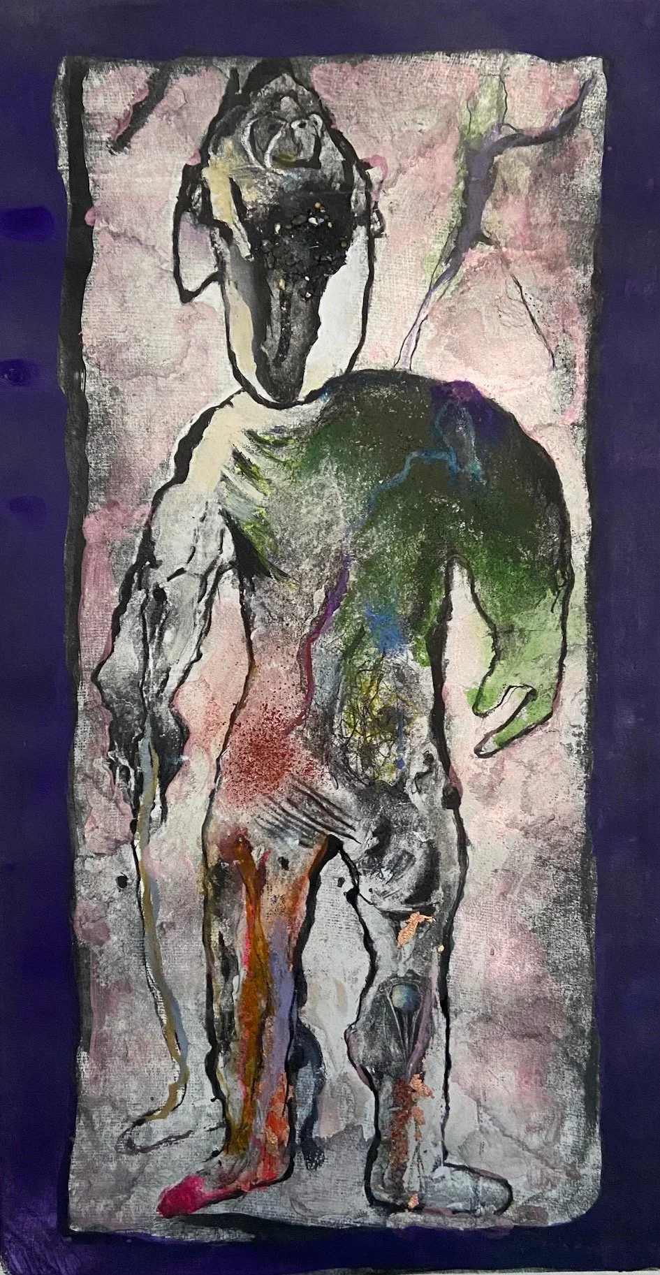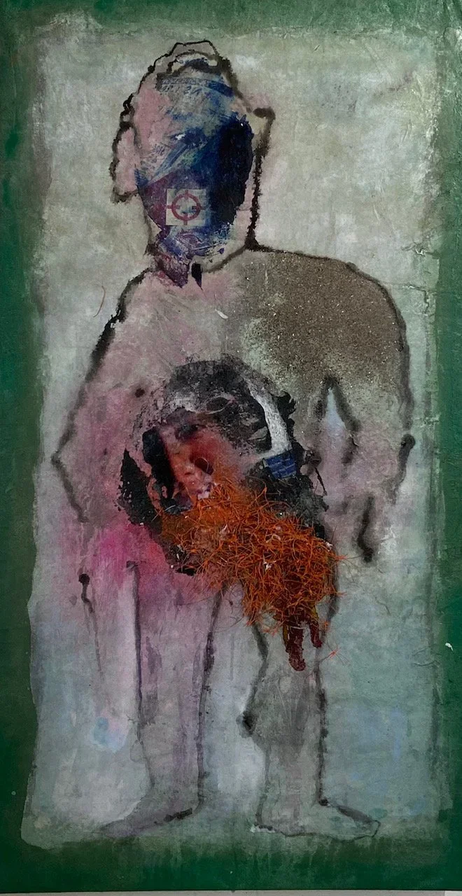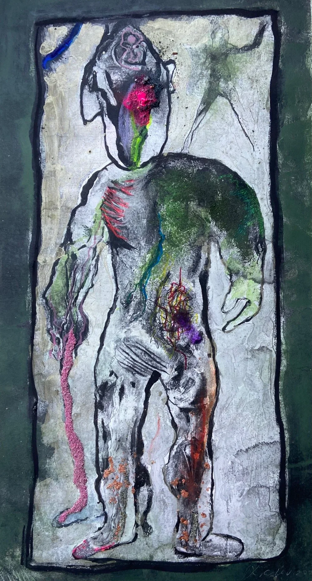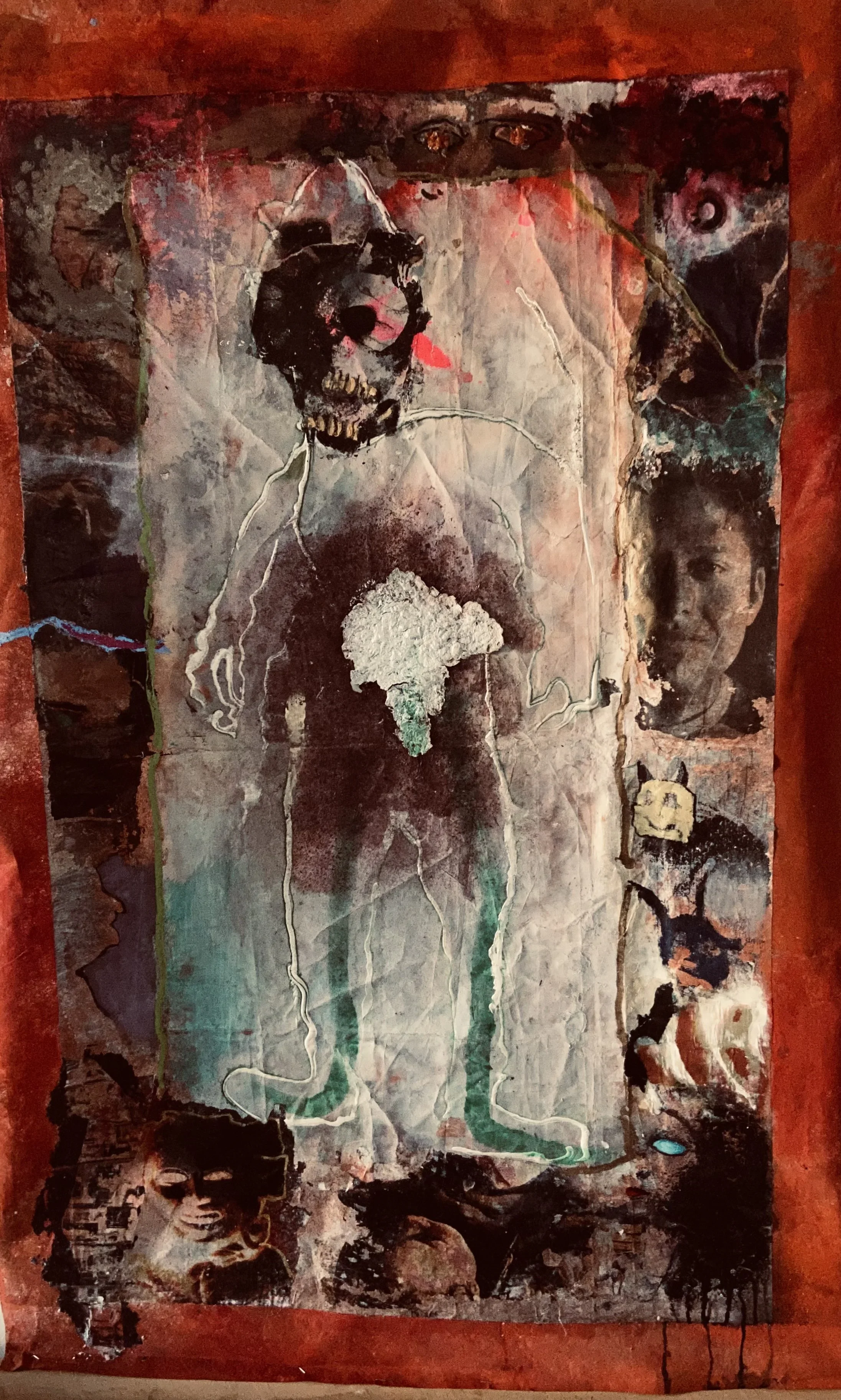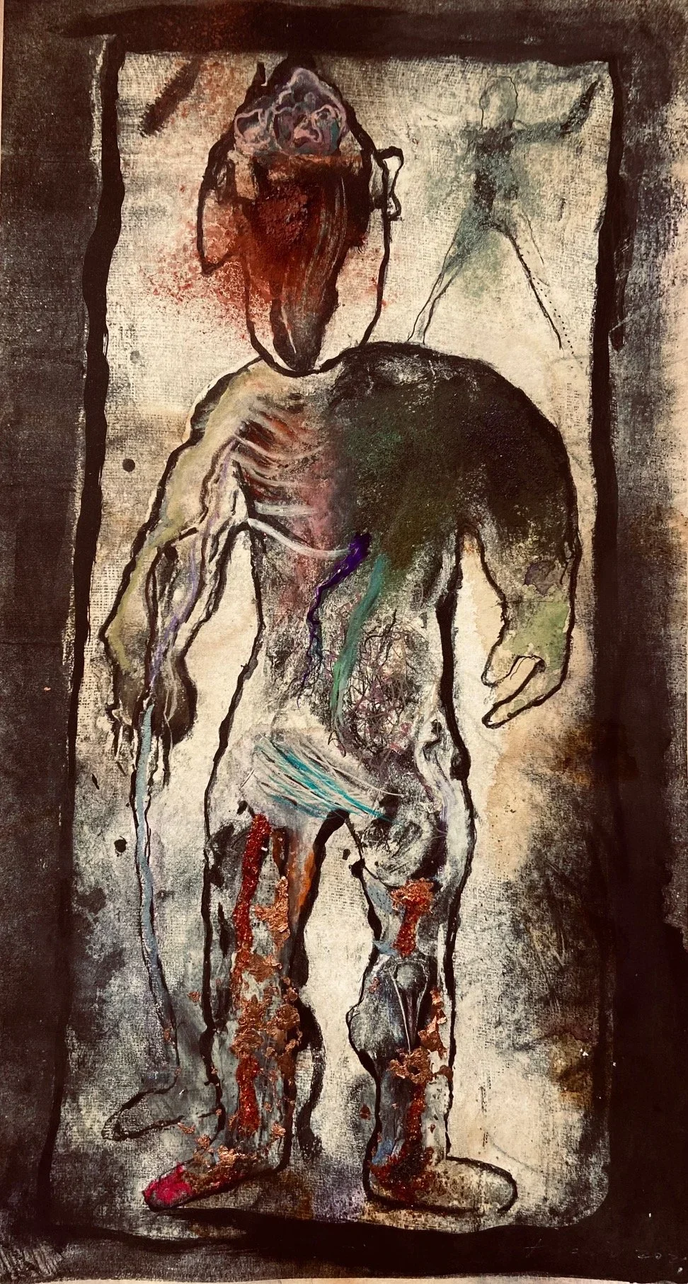 El Grand Duende is based on an image taken from a Spanish colonial text found in Oaxaca, Mexico. It represents a gnome-like figure dressed in a plant-like jumpsuit with a headdress. This enigmatic figure intrigued me because of its mythical allusions. The details of the figure and its costume reminded me of the leaded separations of a stained glass window found in Catholic cathedrals. I transferred a photocopy of the image onto fiberglass mesh and colorized it with acrylic and oil. The frame surrounding the image is ornamented with seeds and the beard is covered with shredded copper filaments. The entire piece is suspended on a curved tree branch.