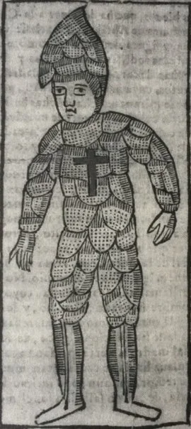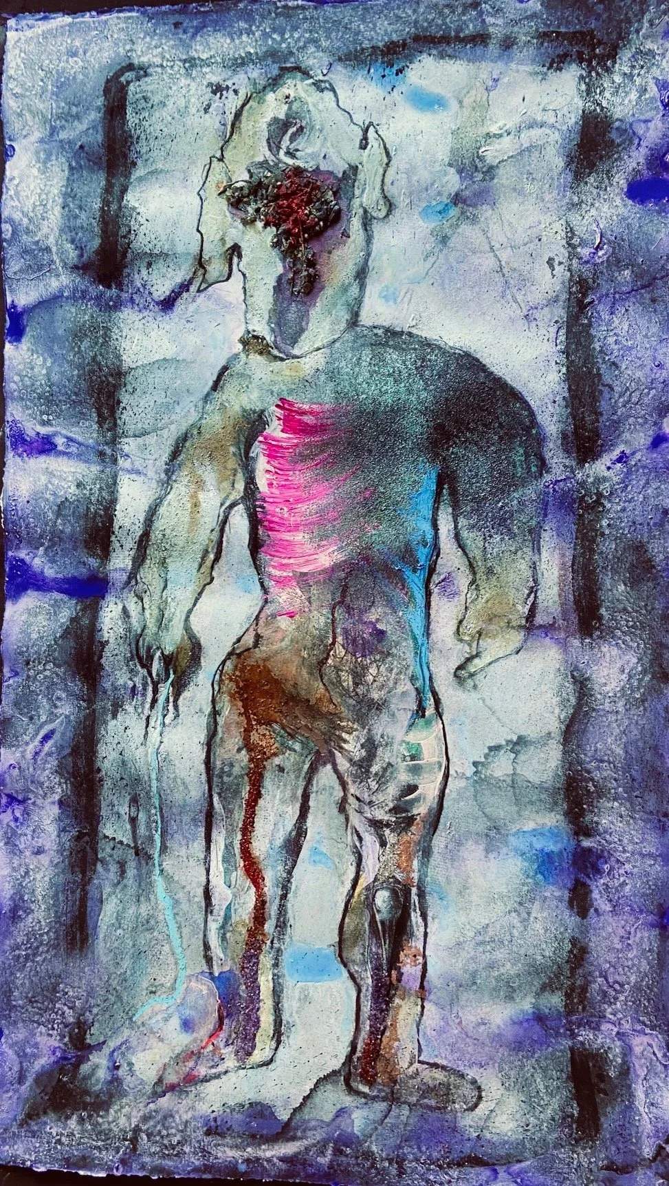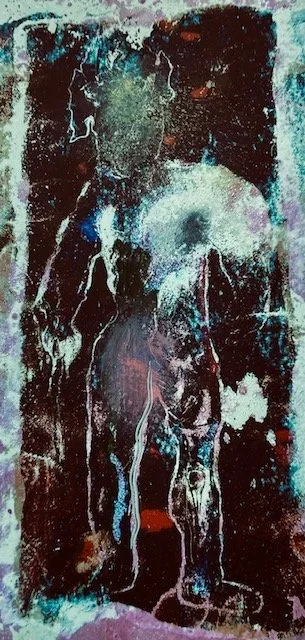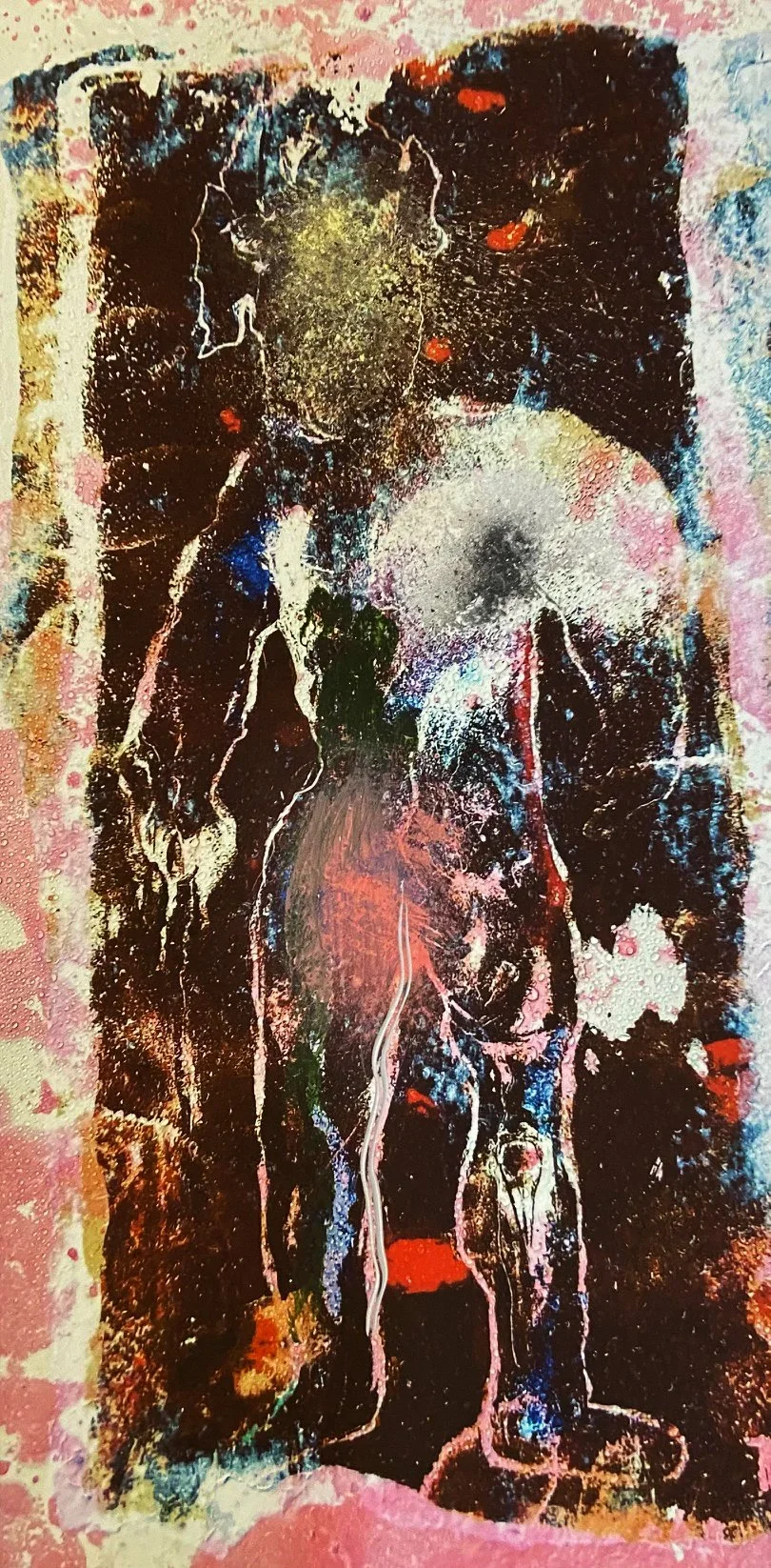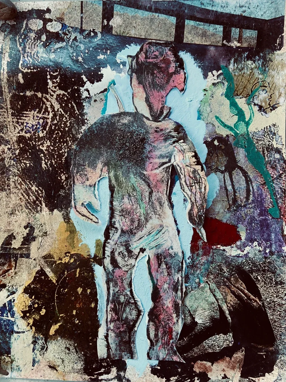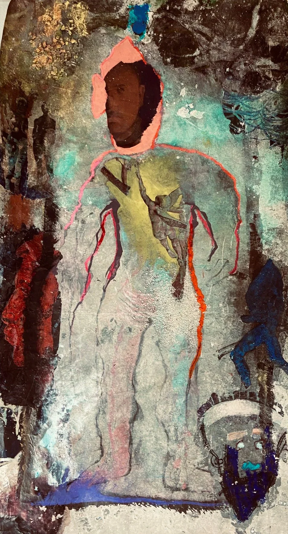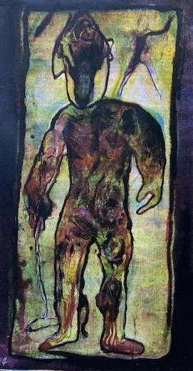 El Grand Duende is based on an image taken from a Spanish colonial text found in Oaxaca, Mexico. It represents a gnome-like figure dressed in a plant-like jumpsuit with a headdress. This enigmatic figure intrigued me because of its mythical allusions. The details of the figure and its costume reminded me of the leaded separations of a stained glass window found in Catholic cathedrals. I transferred a photocopy of the image onto fiberglass mesh and colorized it with acrylic and oil. The frame surrounding the image is ornamented with seeds and the beard is covered with shredded copper filaments. The entire piece is suspended on a curved tree branch.
