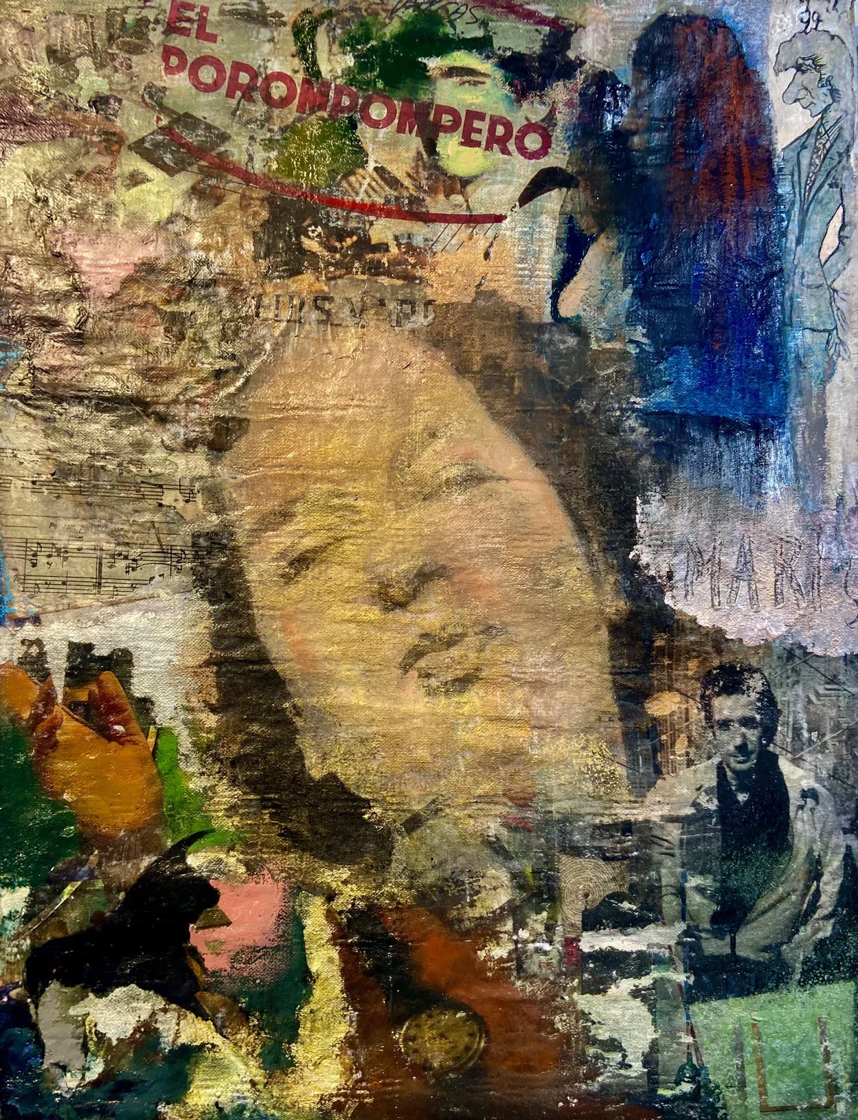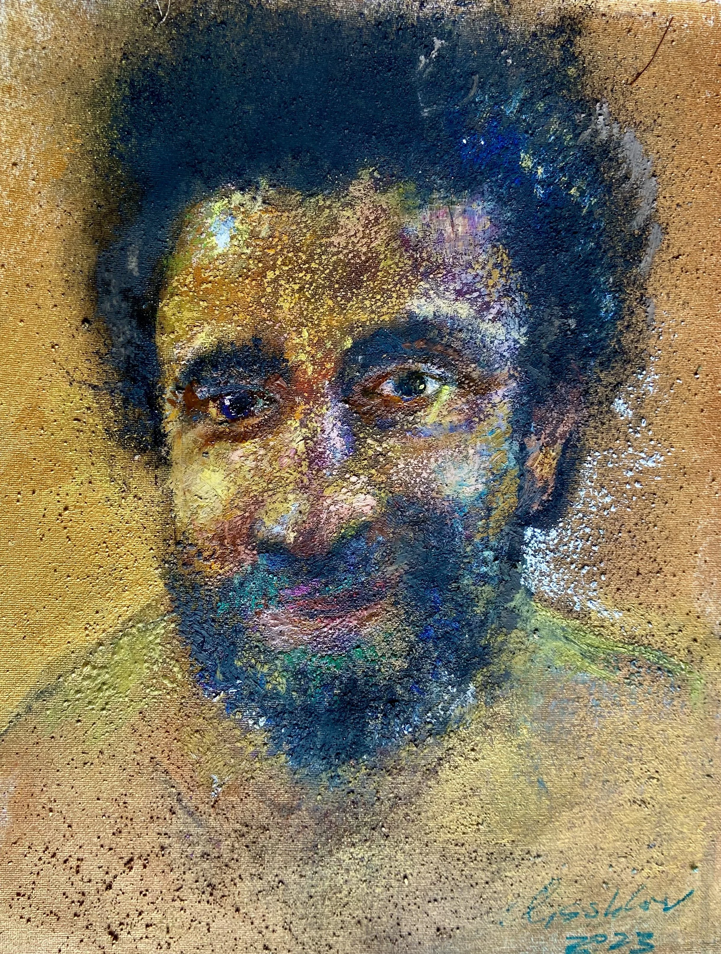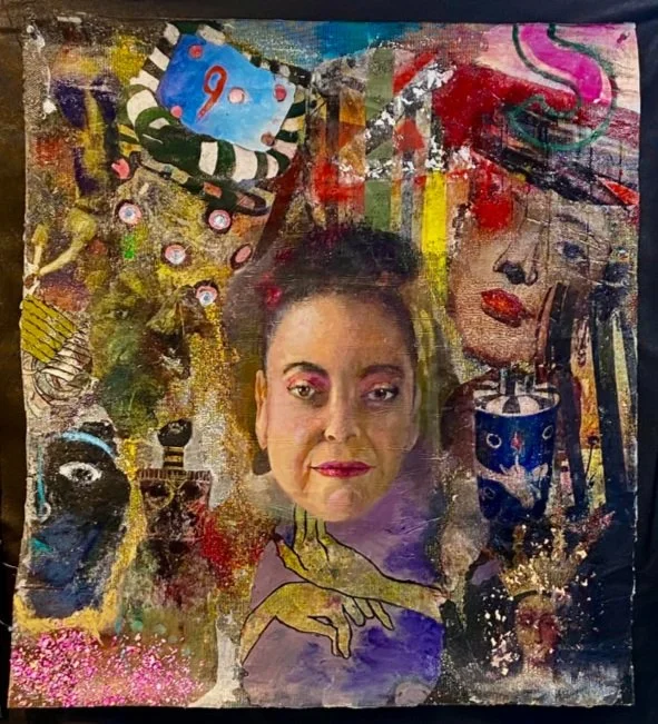 Oil, acrylic, print transfer, powdered pigment, collage, crushed glass on fiberglass mesh