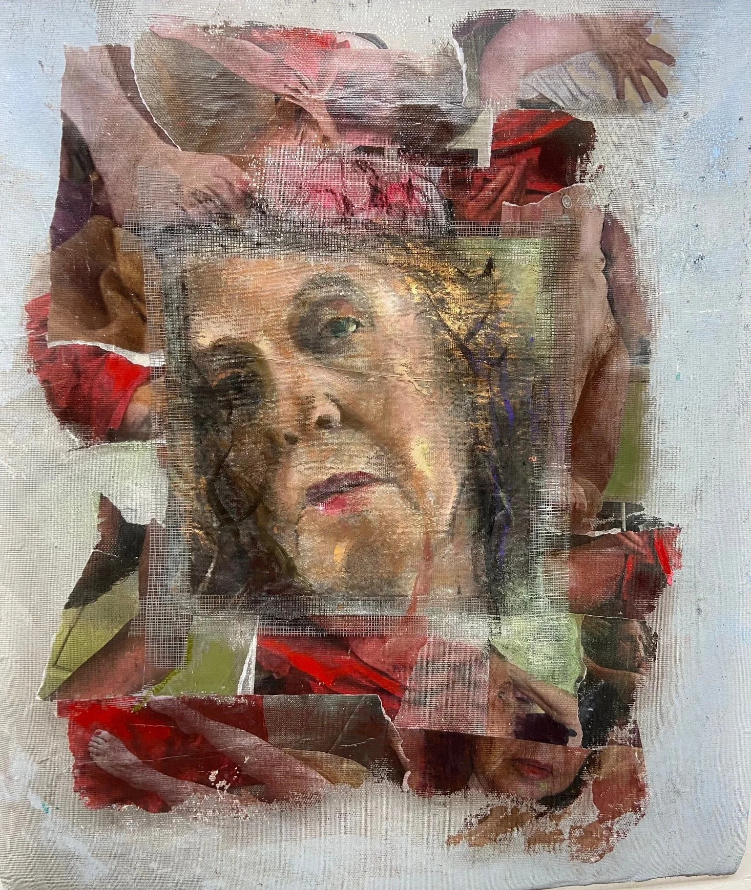 Oil, acrylic, print transfer on fiberglass mesh